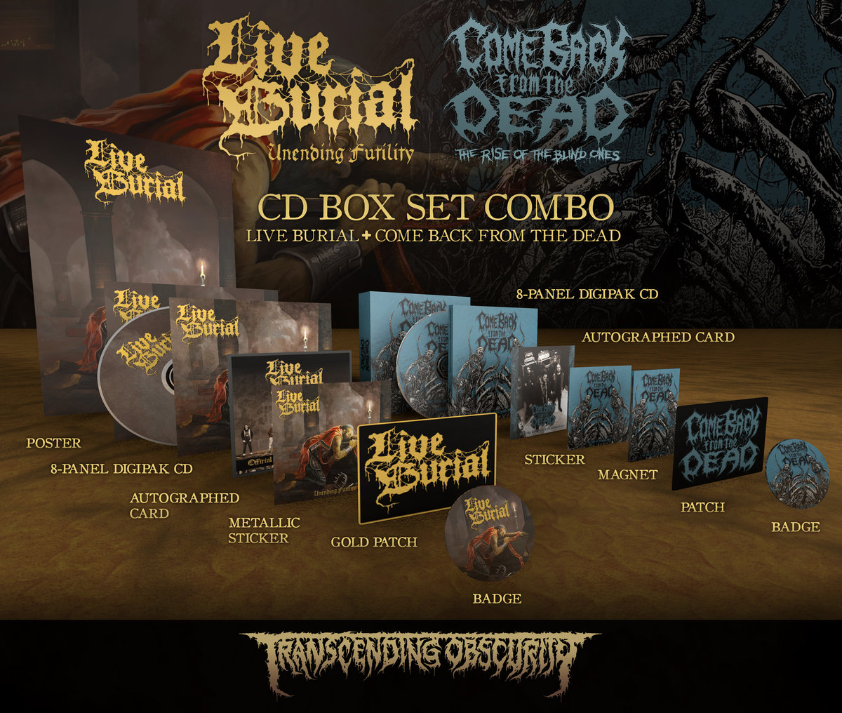 Here's a fine combo offer for the latest albums by old school death metal bands LIVE BURIAL and COME BACK FROM THE DEAD on the limited edition CD box set format. The label mates complement each other and the latter even add a bit of crust to spice things up. Their latest release is a delectable, filthy slab of music that is highly recommended. Check out the music here - comebackfromthedead.bandcamp.com