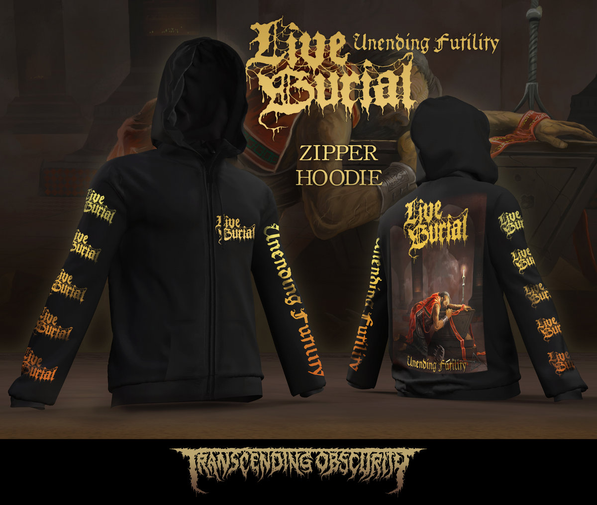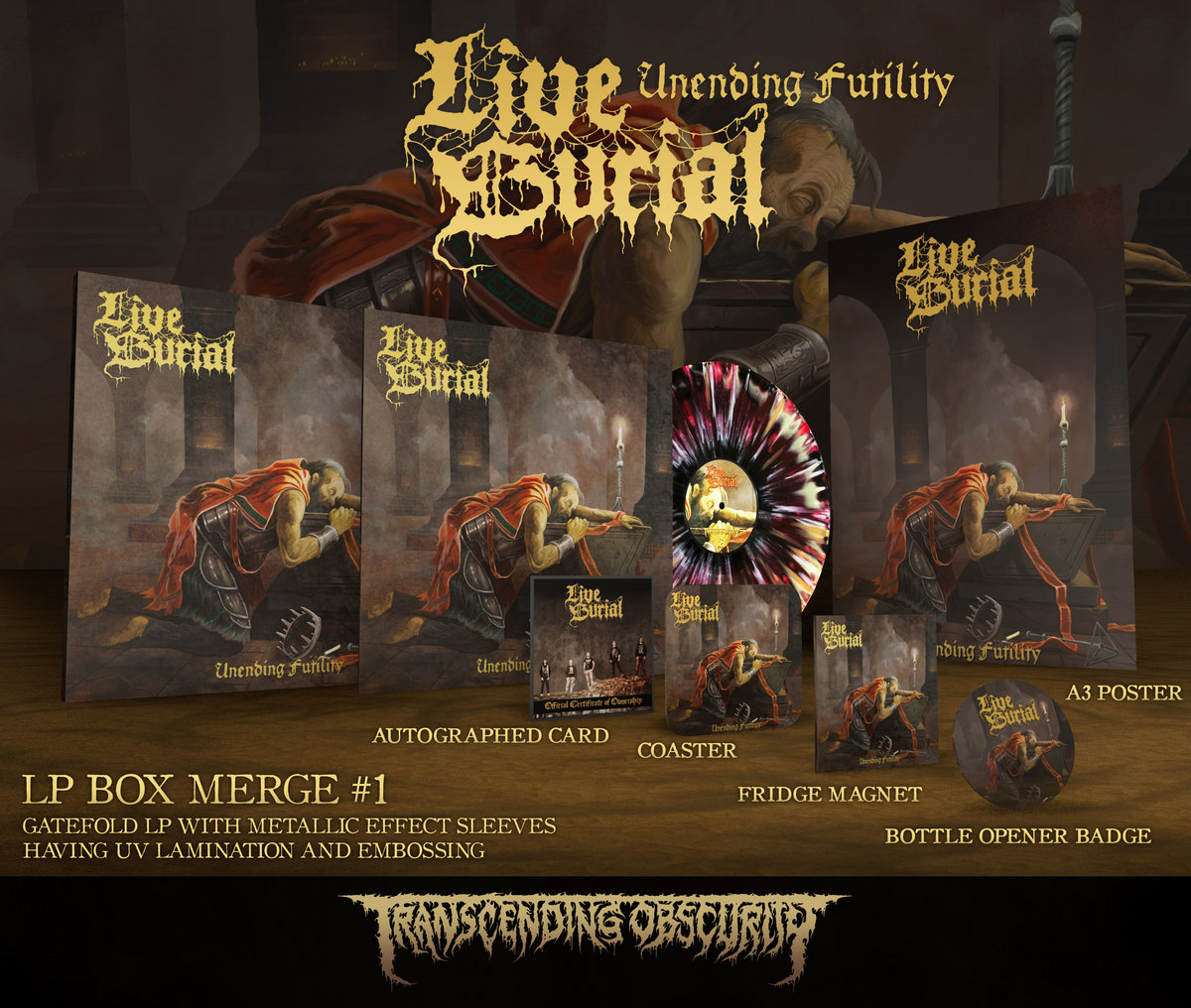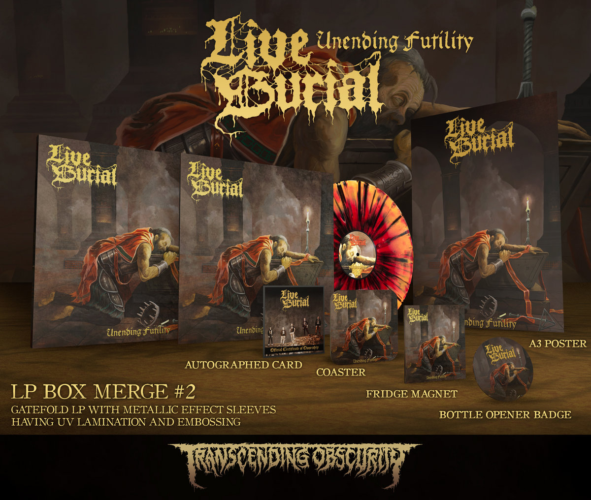 The LIVE BURIAL LP box sets are bound to look spectacular with metallic gold embossing done on all the logos in addition to gloss UV lamination on parts of the artwork. Each of these box sets are limited to only 25 per variant and come with the following exclusive items -